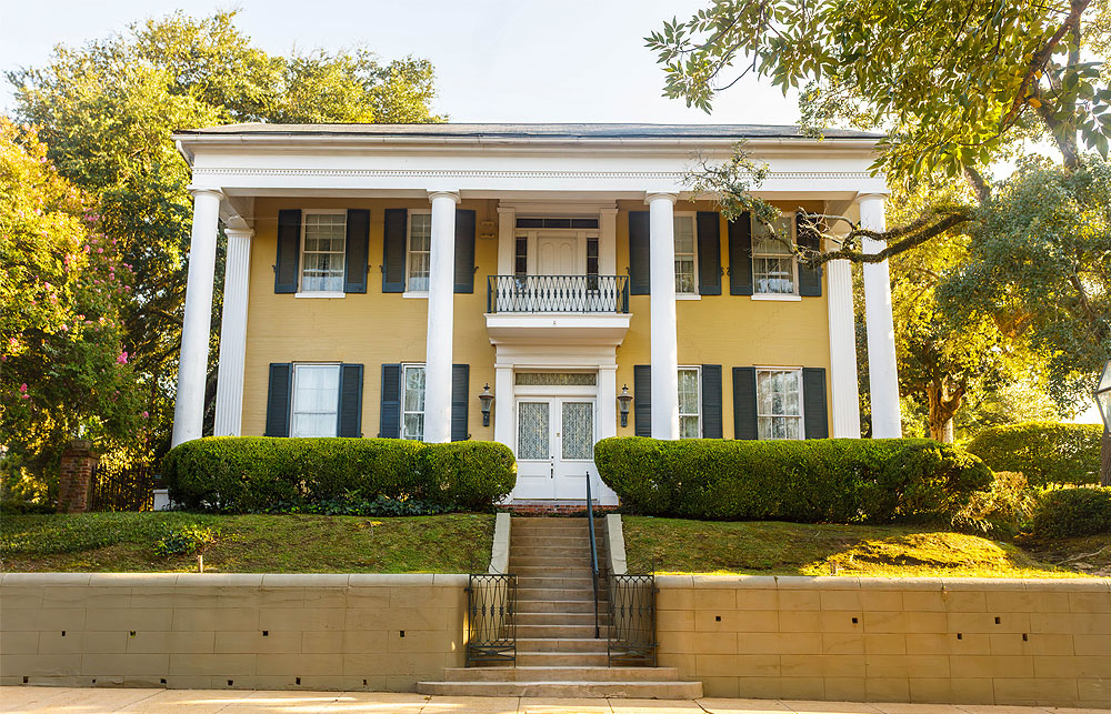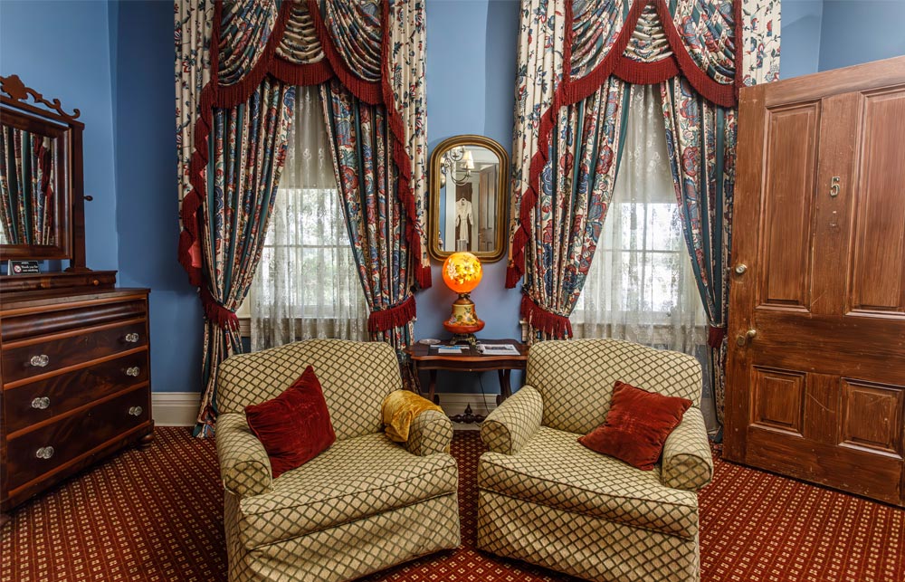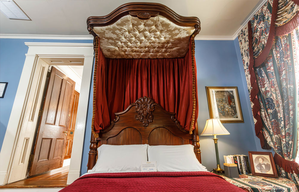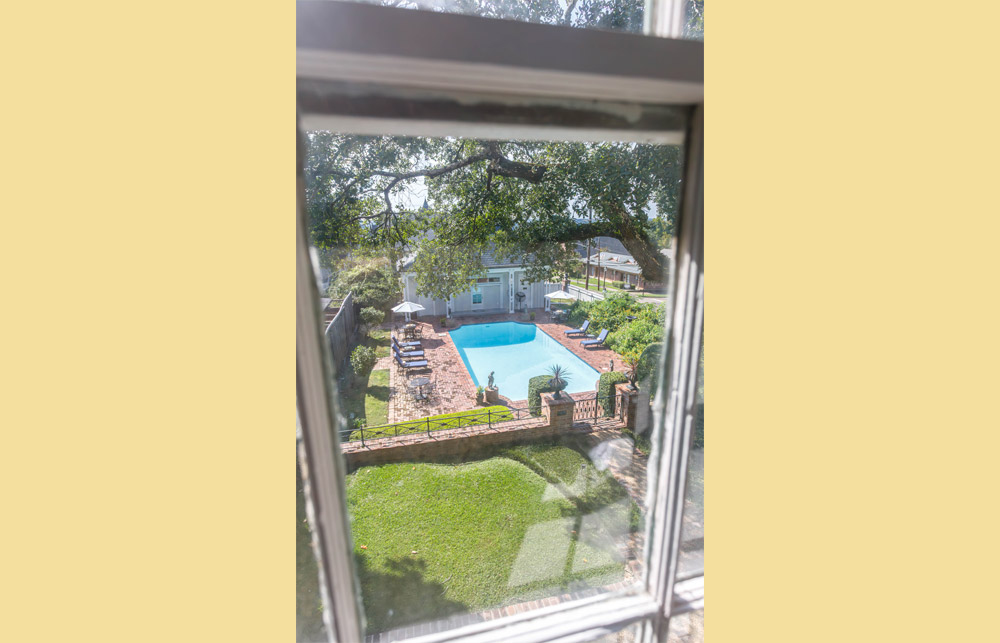 Located at the top of the grand stairway in the historic main house and named for Joseph E. Davis — the early pioneer and patriarchal brother to President Jefferson Davis. This wealthy planter who made Anchuca his last home died at Anchuca on September 18, 1870, at the age of 87. With 12-foot ceilings, period antiques, and lavishly decorated windows, this room provides a sense of what the words master suite are all about. Enjoy a stunning view of Anchuca’s swimming pool and beautifully manicured grounds below. Don’t miss an up-close view from your second floor, private windows of Vicksburg’s oldest columns on the front of Anchuca.