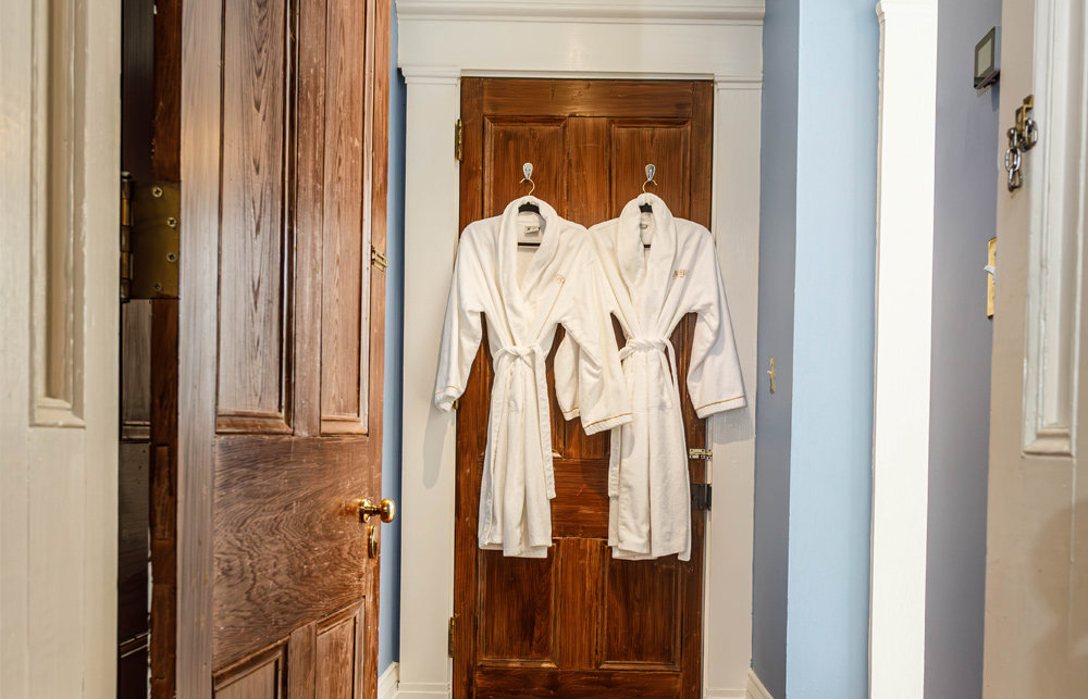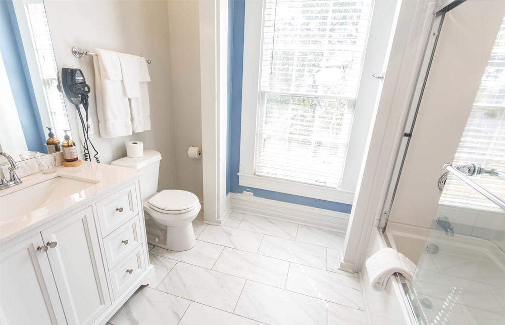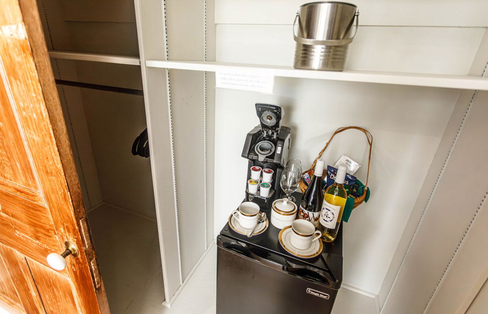 Guests are provided a luxury queen-sized bed, private bathroom with a tub/shower combination, luxury bathrobes, toiletries, hair dryer, mini refrigerator, K-cup coffee maker, mini bar, charging station, high speed WIFI, Roku Smart TV, iron and ironing board, individual thermostat control, priority reservations to our onsite restaurant, and a complimentary Southern-style breakfast followed by an informative orientation video and self-guided house tour.