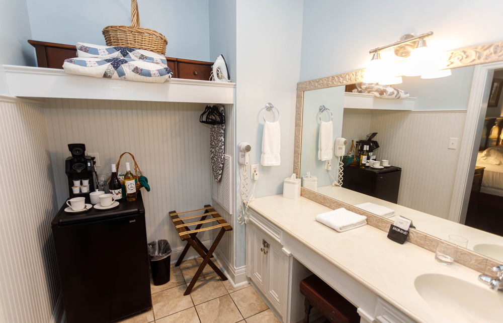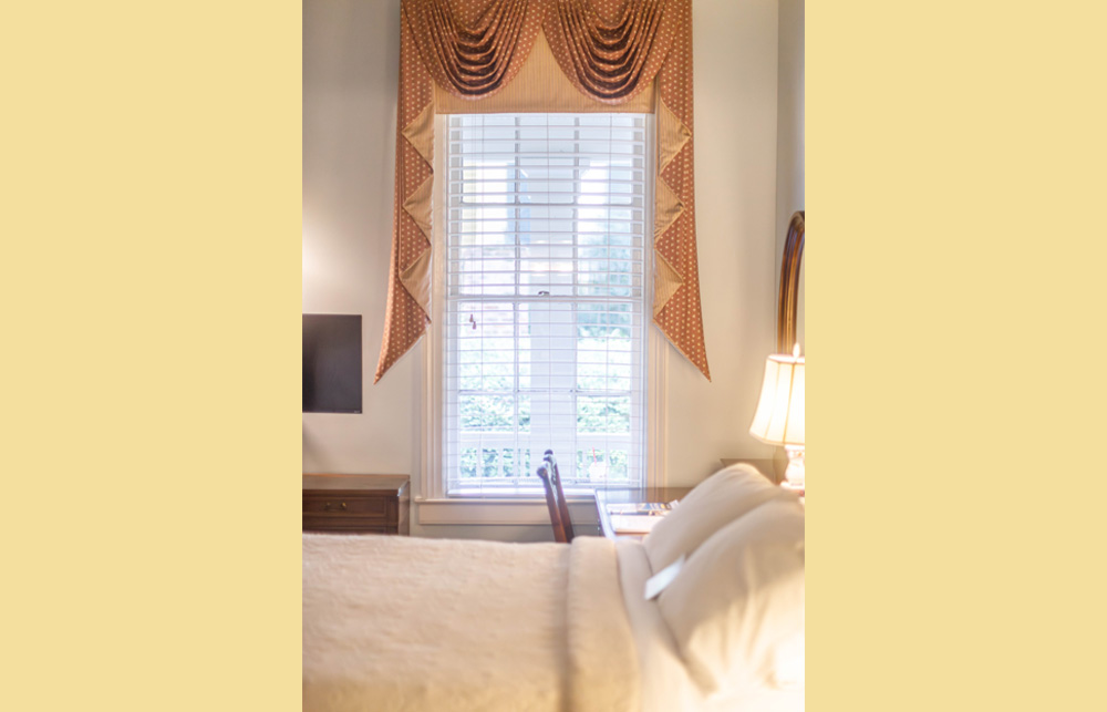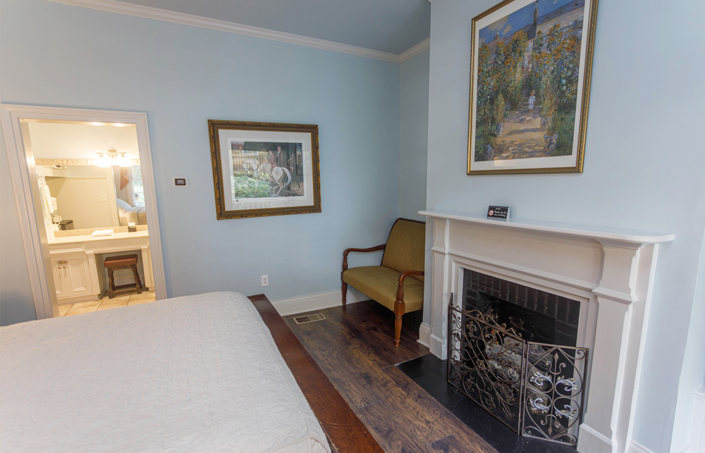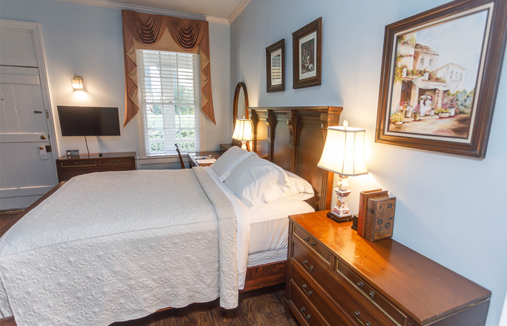 Located in the carriage house, which is a stone’s throw from the main house, this space has been converted into four moderately priced, private guest rooms. Each room features a private bedroom, bathroom with tub/shower combination, and dressing area along with a mini refrigerator, K-cup coffee maker, mini bar, charging station, high speed WIFI, Roku Smart TV, iron and ironing board, individual thermostat control, toiletries, first priority for reservations to our onsite restaurant, and a complimentary Southern-style breakfast followed by an informative orientation video and self guided house tour. Each room also features high ceilings and a front porch seating area with a beautiful view of the historic main house. Pets are welcomed in all carriage house rooms.