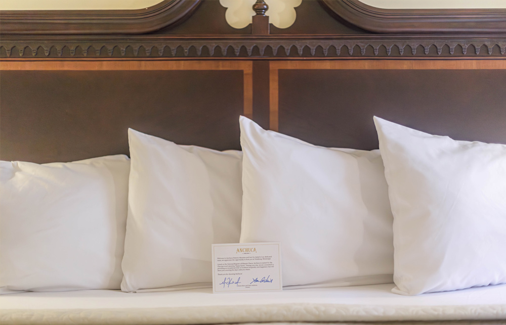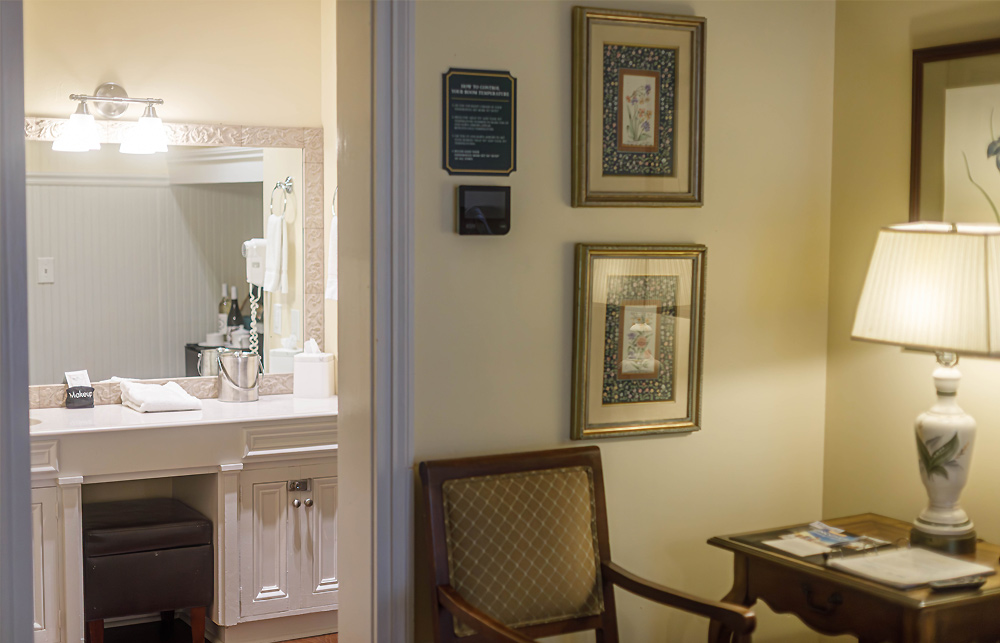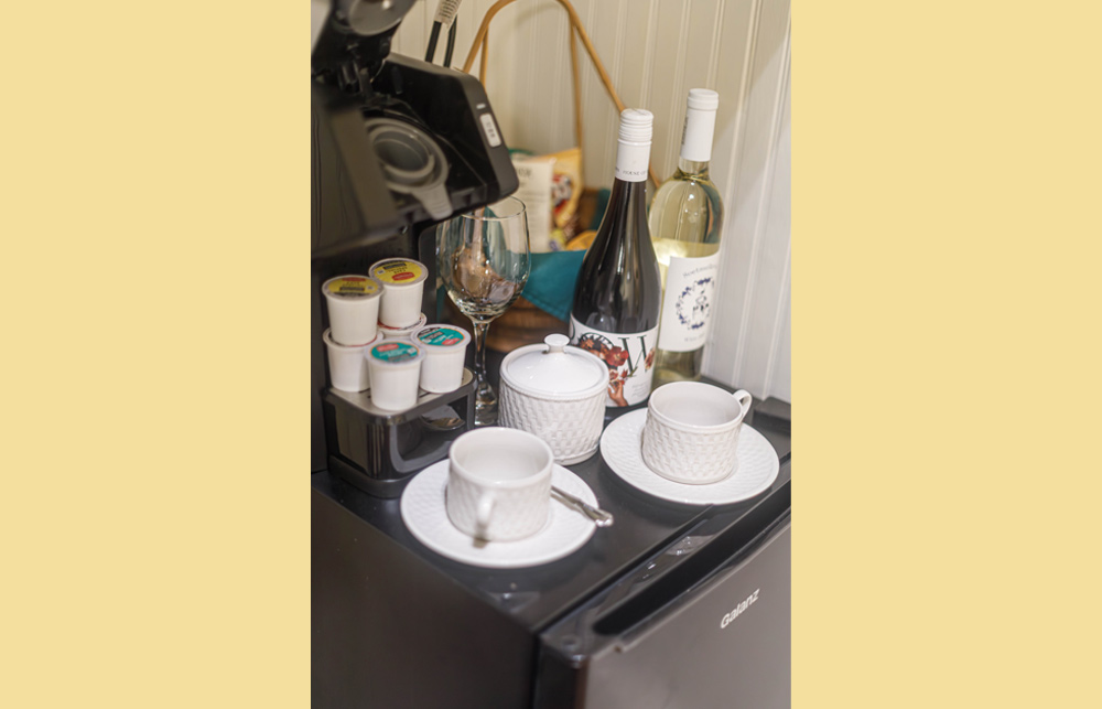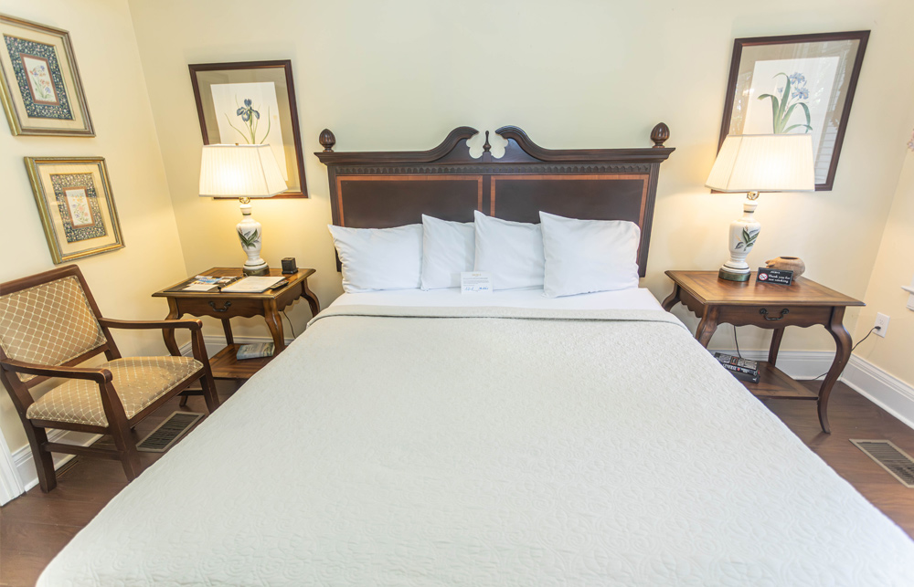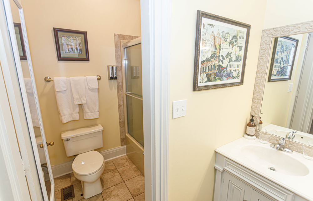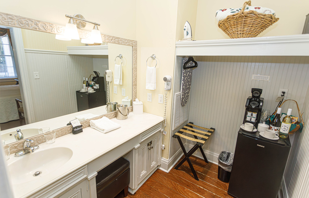 Located in the carriage house, which is a stone’s throw from the main house, this space has been converted into four moderately priced, private guest rooms. Each room features a private bedroom, bathroom with tub/shower combination, and dressing area along with a mini refrigerator, K-cup coffee maker, mini bar, charging station, high speed WIFI, Roku Smart TV, iron and ironing board, individual thermostat control, toiletries, first priority for reservations to our onsite restaurant, and a complimentary Southern-style breakfast followed by an informative orientation video and self guided house tour. Each room also features high ceilings and a front porch seating area with a beautiful view of the historic main house. Pets are welcomed in all carriage house rooms.